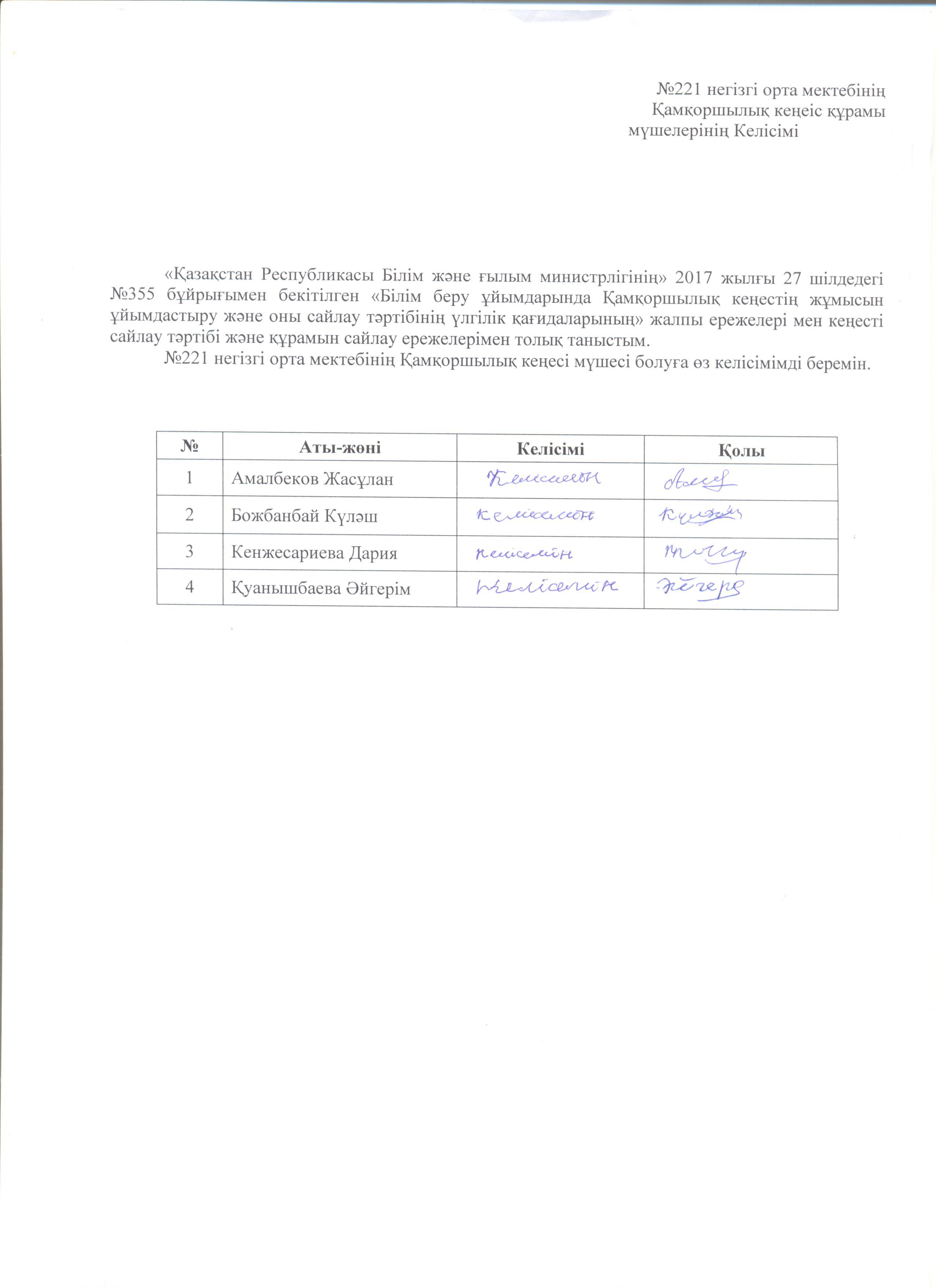 Қамқоршылық кеңес мүшелерінің келісімі 2019-2020 оқу жылы » №221 орта мектебі