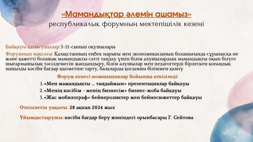"Мамандық әлемін ашамыз" атты республикалық форумының аудандық кезеңіне қатысушыларды іріктеу мақсатында а.ж. 28 ақпанында сағат 15/00де мектептің акт залында мектепішілік кезең өткізіледі. Осыған байланысты ережеге сай 11-17 жас аралығындағы оқушылар