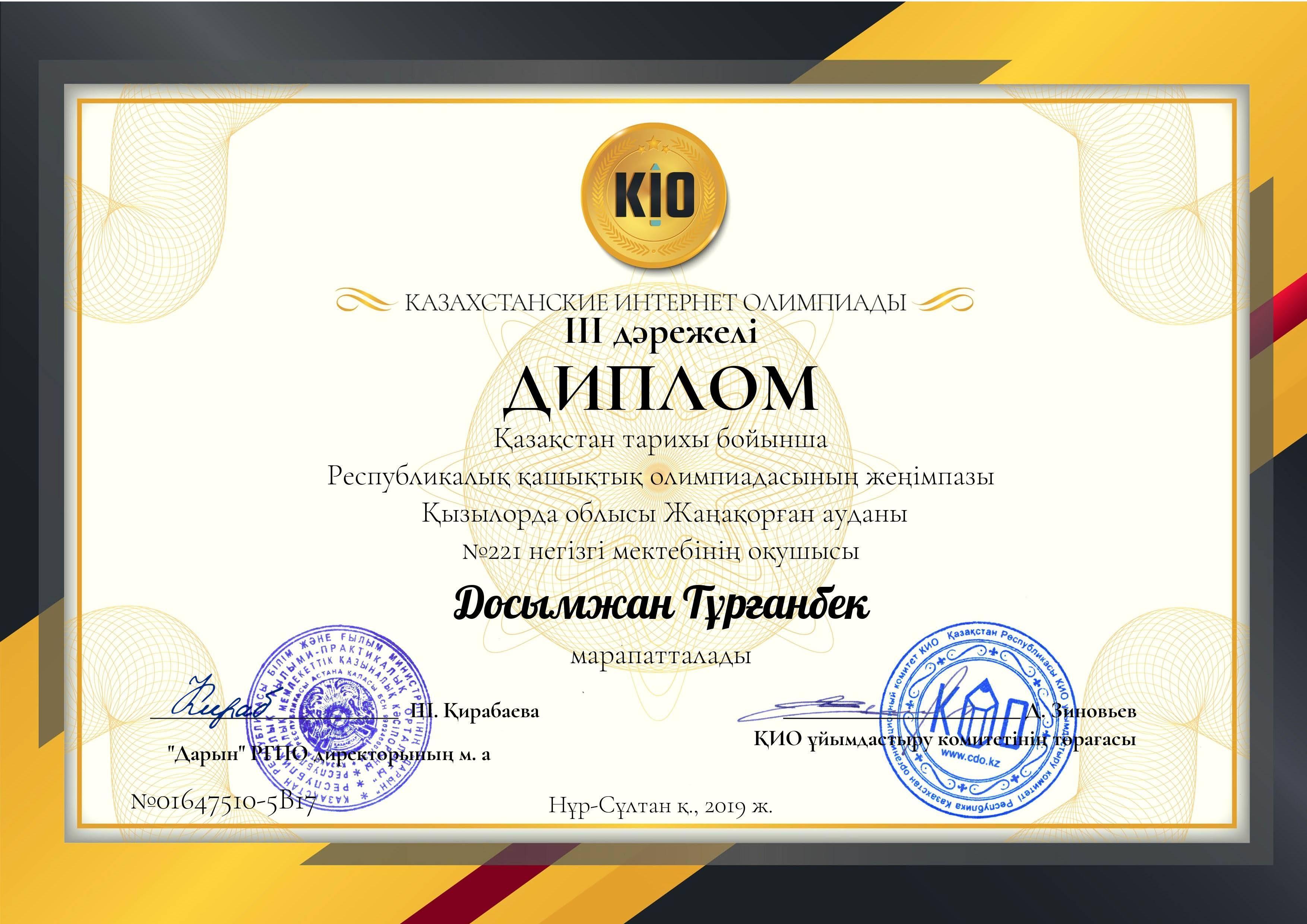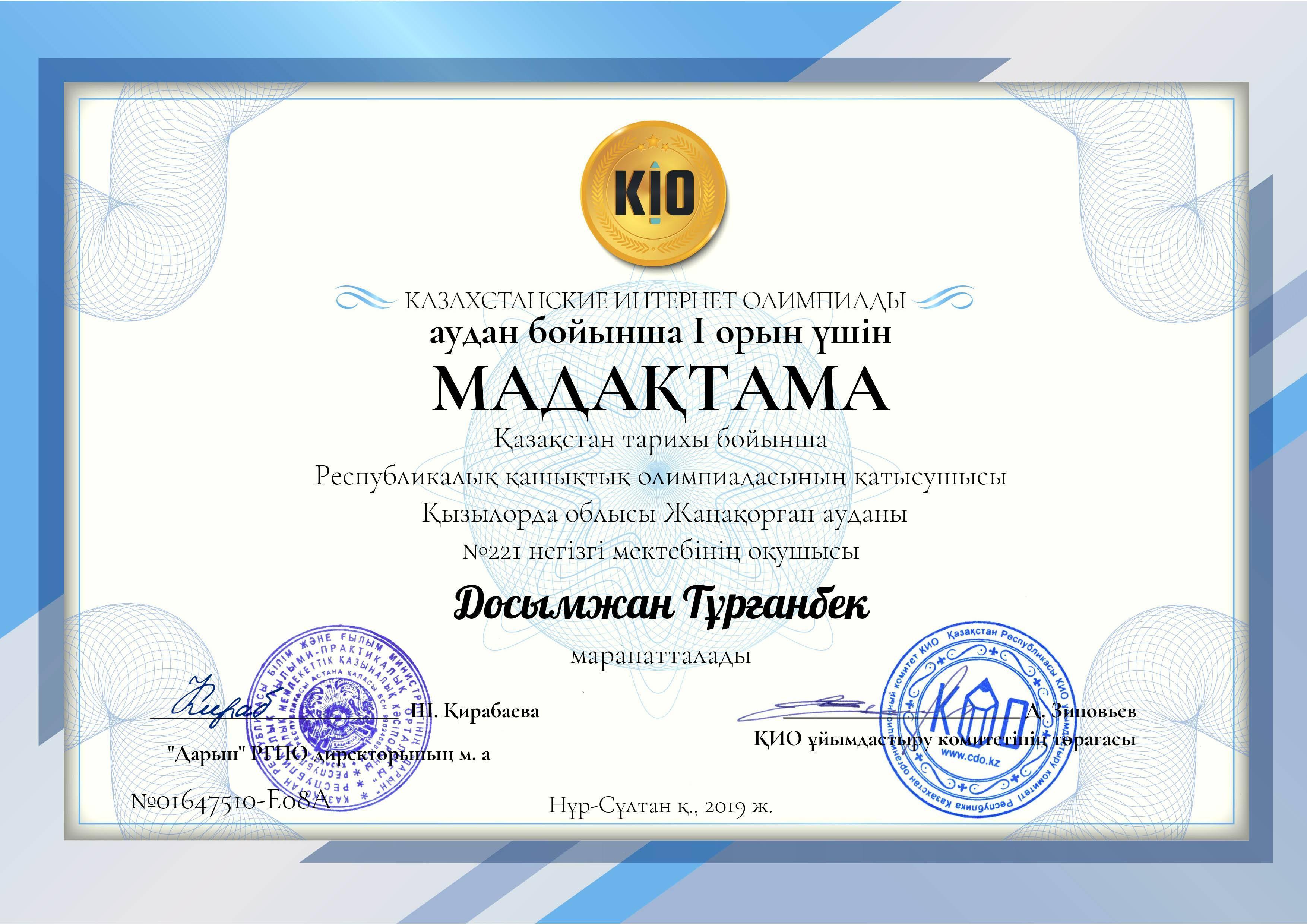 2019 жылдың 17 қазанында оқушылар арасында Қазақстан тарихы пәні бойынша өткізілген Қазақстан интернет олимпиадасында 6-сынып оқушысы Тұрғанбек Досымжан республика бойынша ІІІ, облыс ,аудан бойынша І орындарды иеленді. 7-сынып оқушысы Түймебайқызы Аяулым облыс, аудан бойынша ІІ орындарды иеленді.