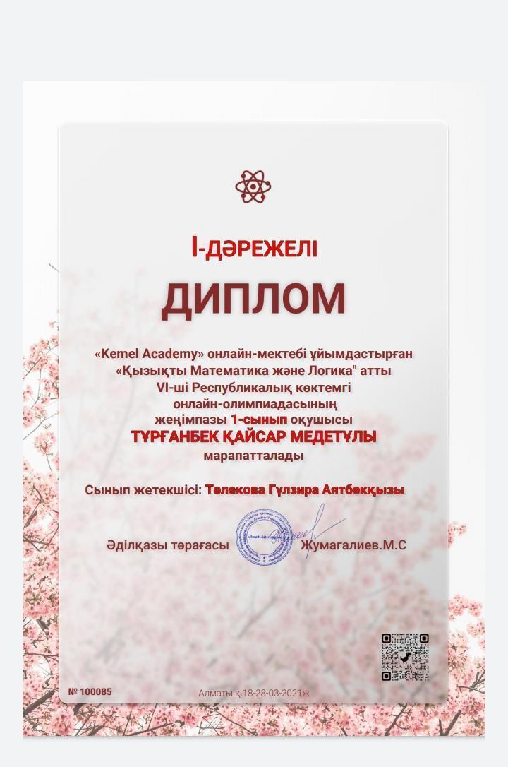 "Kemel Academy" онлайн мектебі ұйымдастырған "Қызықты математика және логика" атты ҮІ-ші Республикалық көктемгі онлайн-олимпиадасына қатысқан 1-сынып оқушысы Тұрғанбек Қайсар І дәрежелі дипломмен мараппатталды. Сынып жетекшісі: Г.Төлекова