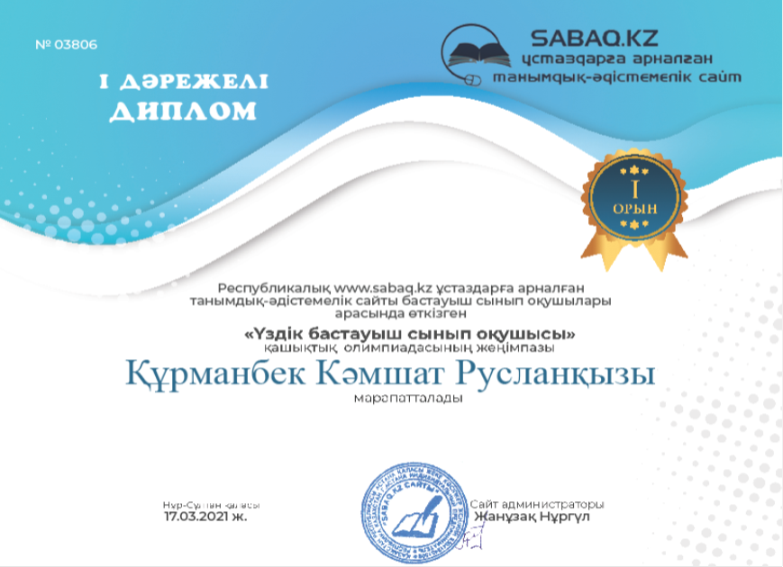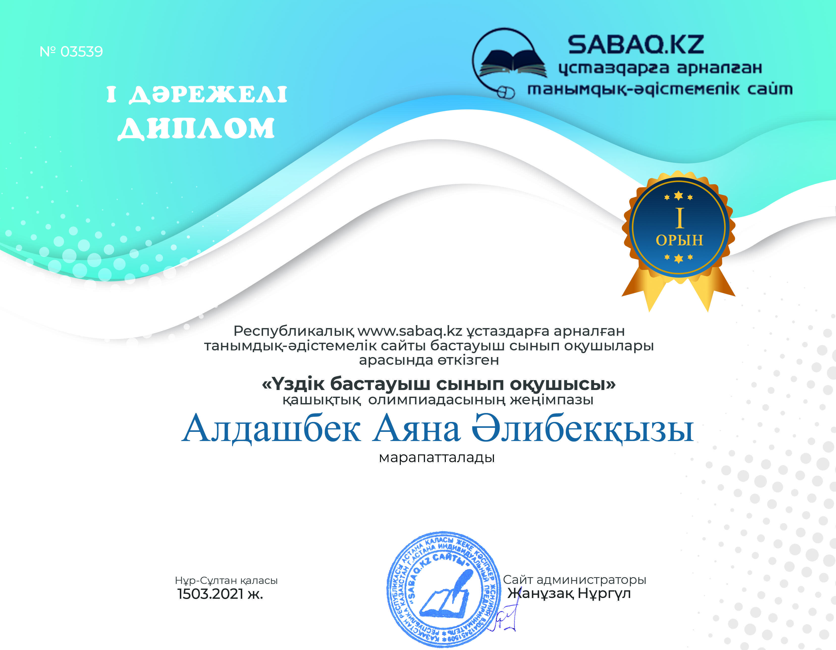 12 апрель 2021 0 1 2 3 4 5 "Үздік бастауыш сынып оқушысы" олимпиадасының жеңімпаздары Республикалық www.sabaq.kz ұстаздарға арналған танымдық-әдістемелік сайты бастауыш сынып оқушылары арасында өткізген "Үздік бастауыш сынып оқушысы" қашықтық олимпиадасының жеңімпаздары 1-мынып оқушылары жүлделі дипломдармен марапатталды. Сынып жетекшісі: Г.Төлекова.