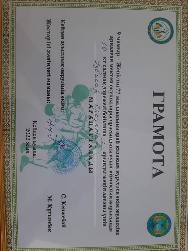 №221 негізгі орта мектебінің оқушылары "Балалар жылы" аясында, 9 мамыр Жеңіс күніне орай Кейден ауылдық округінің әкімі жүлдесі үшін қазақша күрестен ұйымдастырылған жарысқа қатысып жүлделі орындарға ие болды.