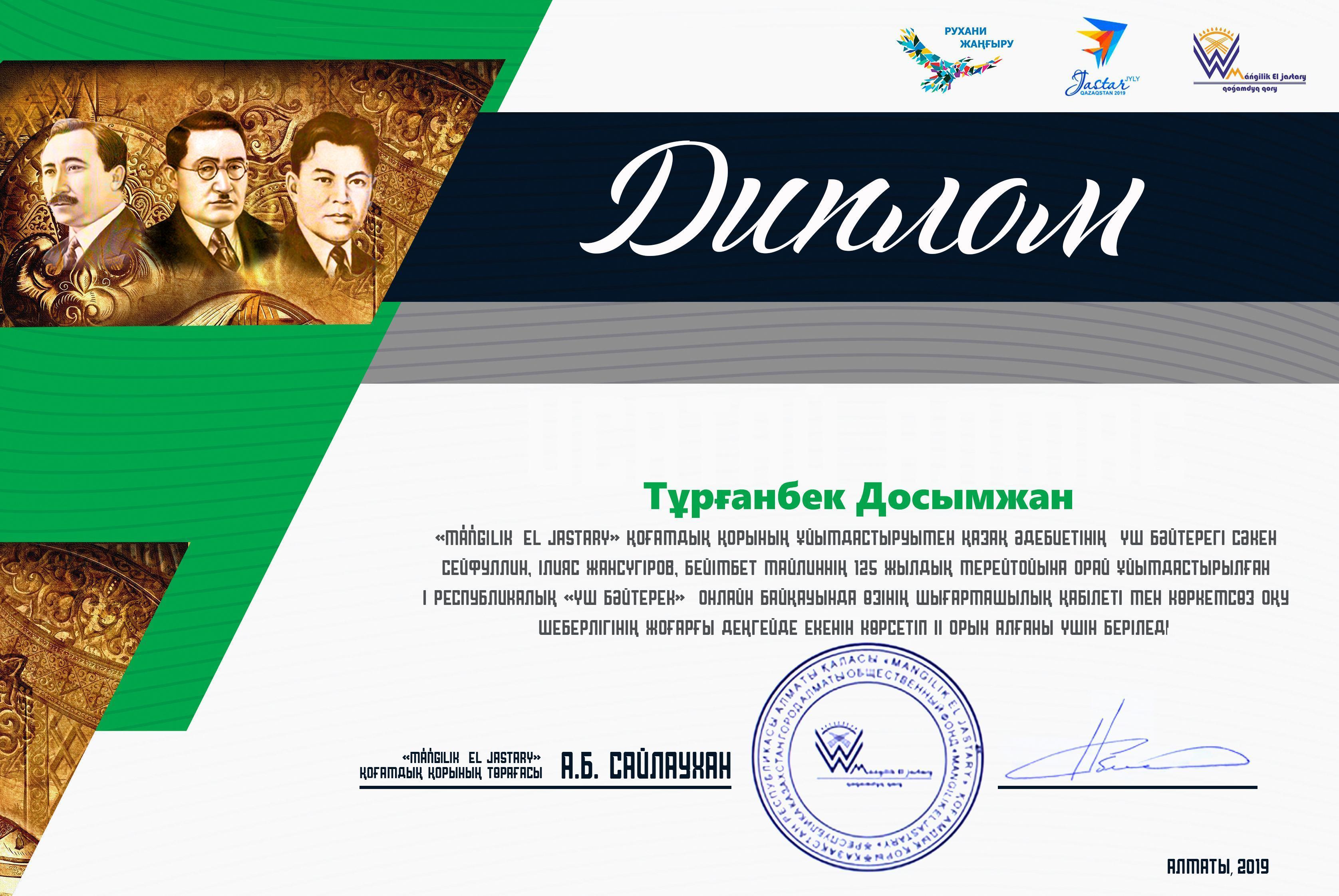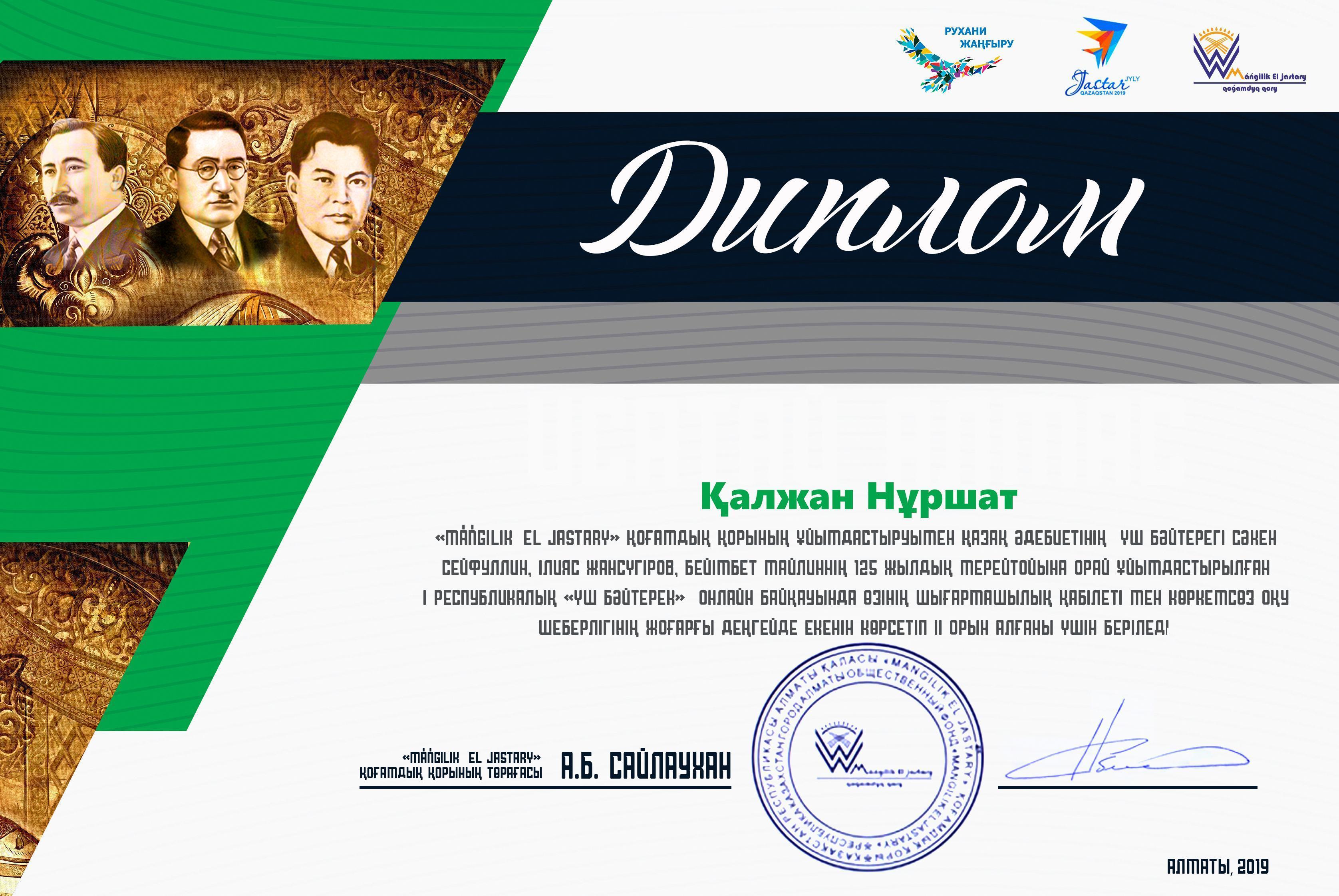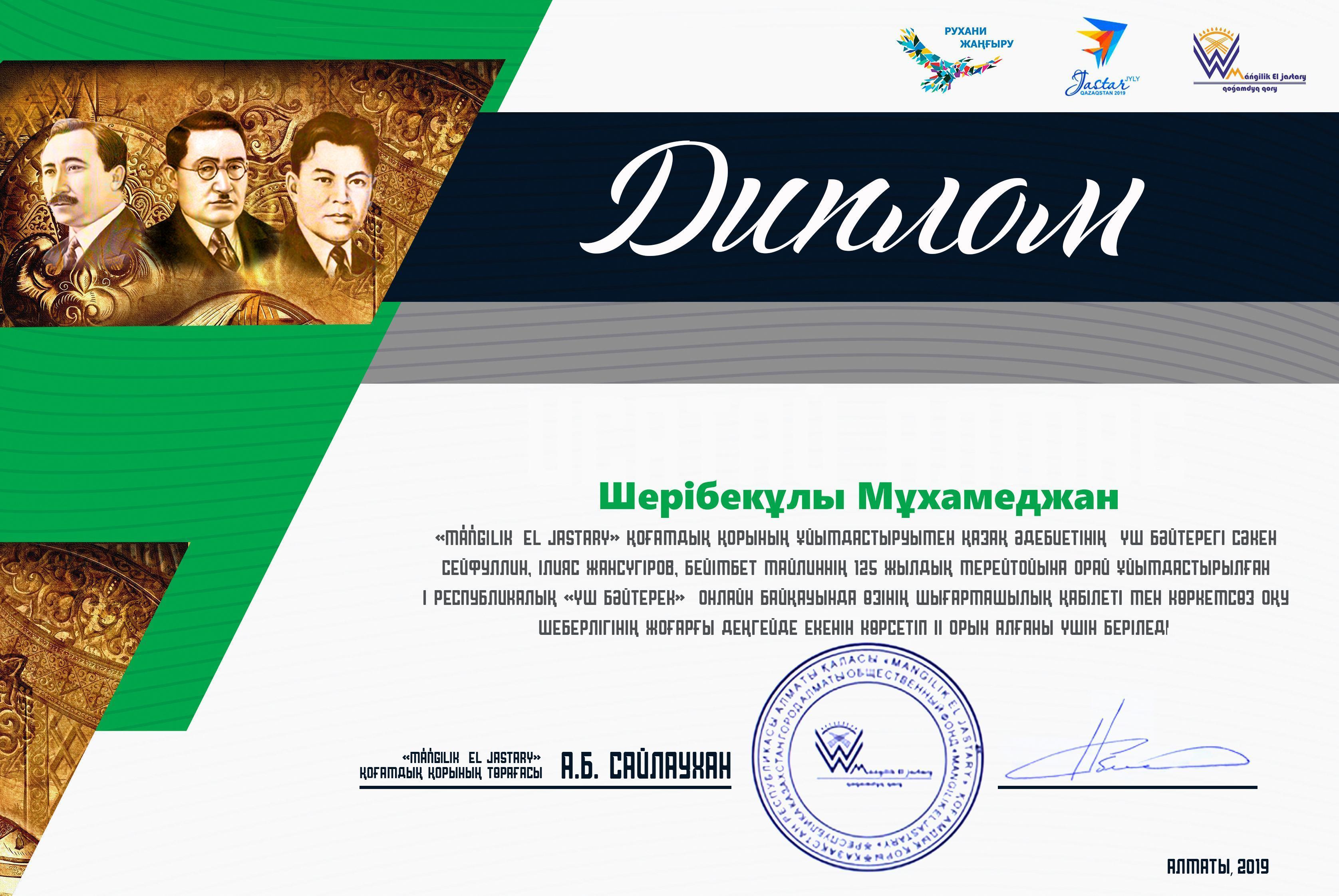 "Мәңгілік ел жастары" қоғамдық қорының ұйымдастыруымен қазақ әдебиетінің үш бәйтерегі Сәкен Сейфуллин, Ілияс Жансүгіров және Бейімбет Майлиннің 125 жылдық мерейтойына орай ұйымдастырылған І Республикалық "Үш бәйтерек" онлайн байқауында өзінің шығармашылық қабілеті мен көркемсөз оқу шеберлігінің жоғары деңгейде екенін көрсеткен біздің мектептің оқушылары жүлделі орындарға ие болды.