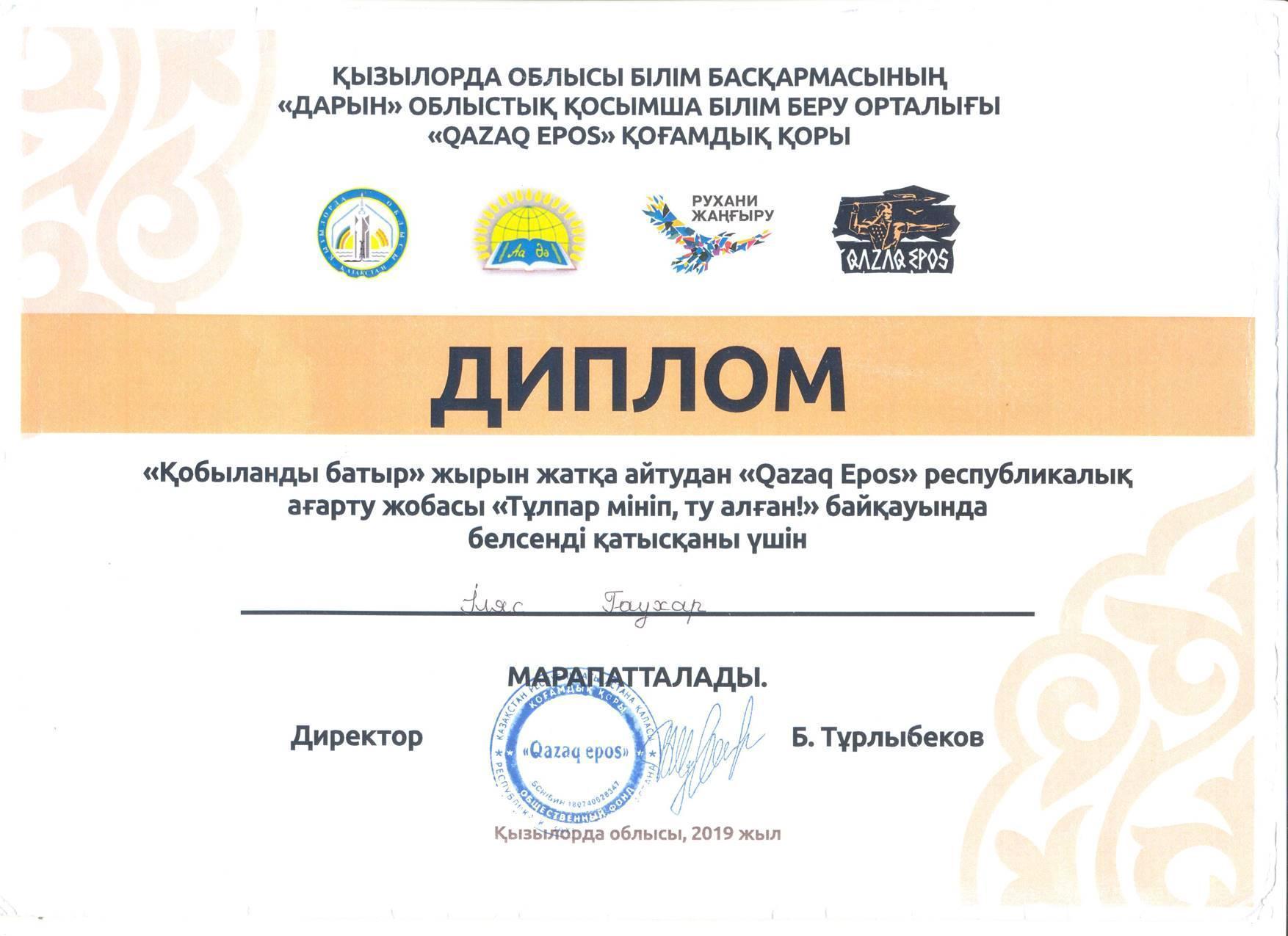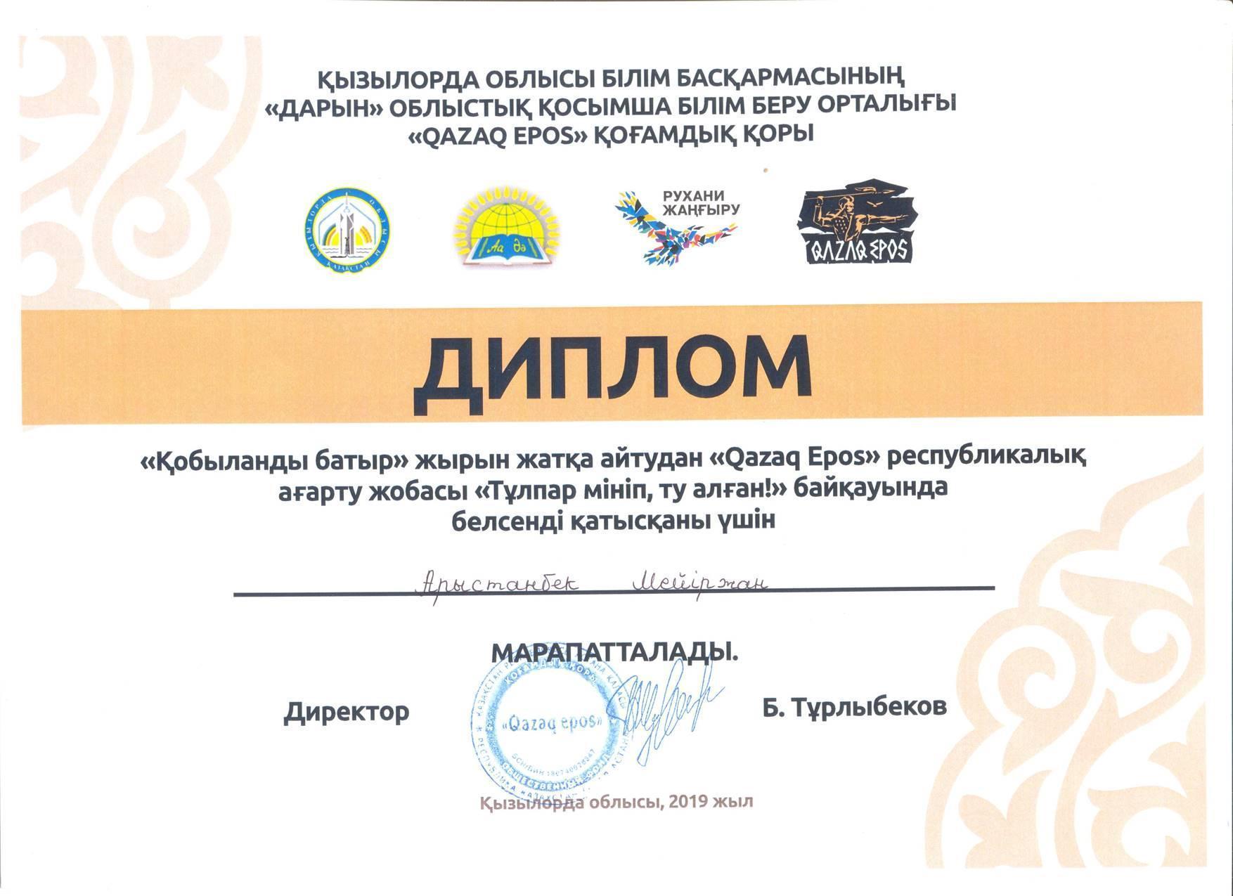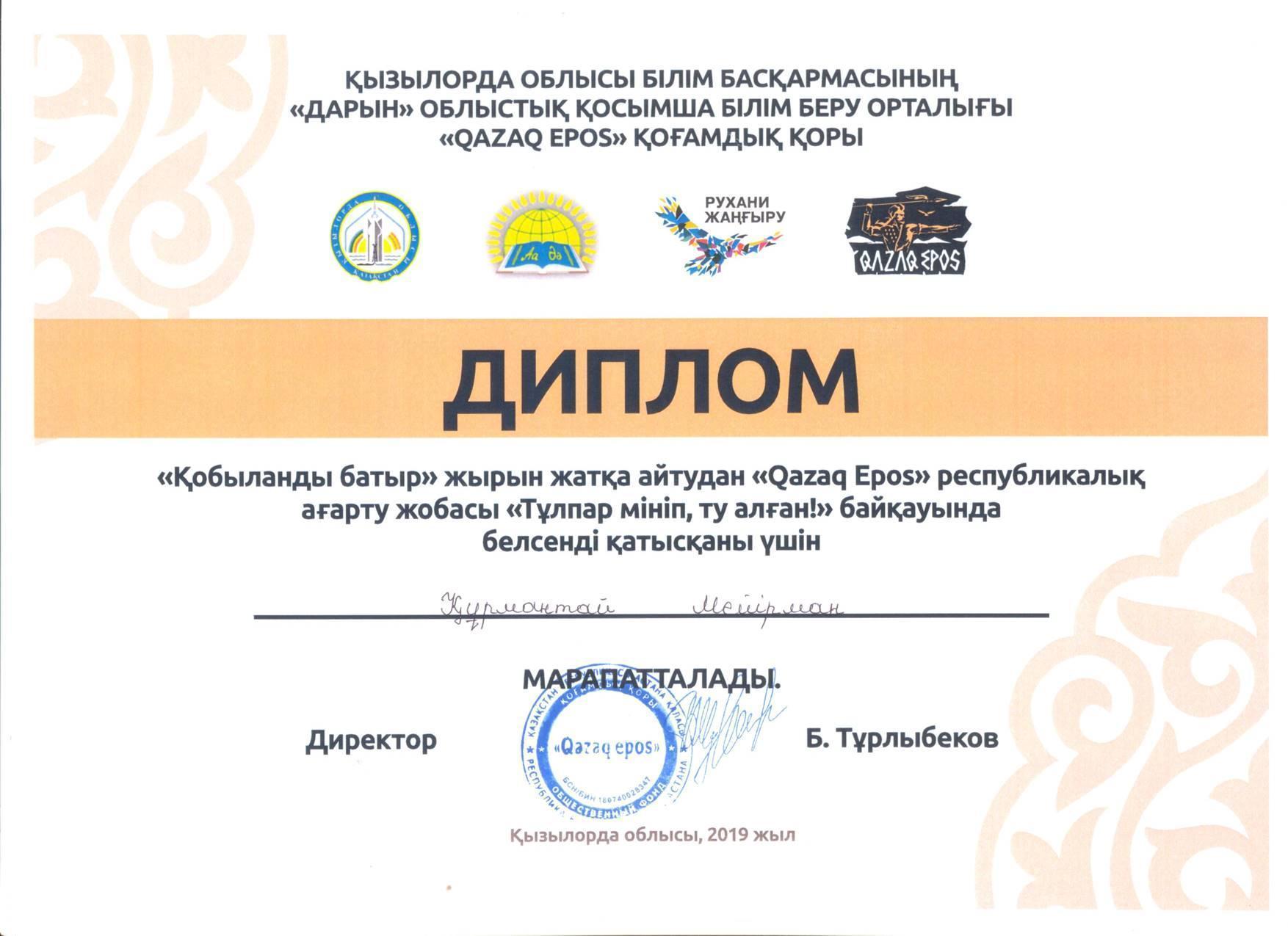 2019 жылдың 16 қыркүйегі күні «Тұлпар мініп ту алған» атты батырлар жырын жатқа айтуда аудандық кезеңінен 9-сынып оқушысы Илияс Гаухар, 7-сынып оқушылары Мейіржан Арыстанбек, Мейірман Құрмантайлаар Алғыс хат иеленді. Оқушылар «Қобыланды батыр » жырын жатқа айтты.