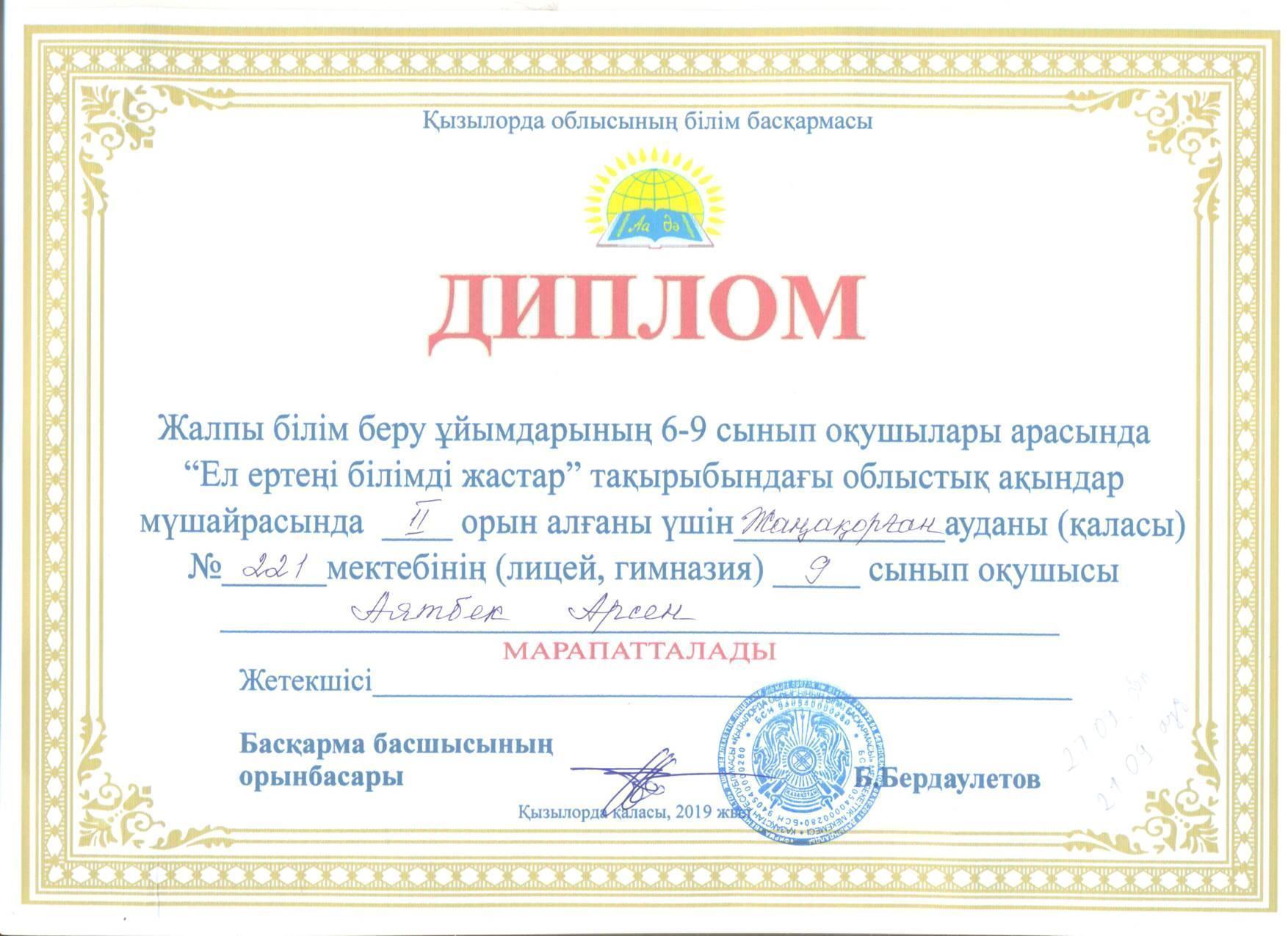 2019 жылдың 27 қыркүйегі күні 9-сынып оқушысы А.Аятбек жастар жылына байланысты ұйымдастырылған облыстық «Ел ертеңі – білімді жастар» тақырыбындағы ақындар мүшайрасынан екінші орын алды.Талапты жас өз өнерімен көпті тәнті етті.