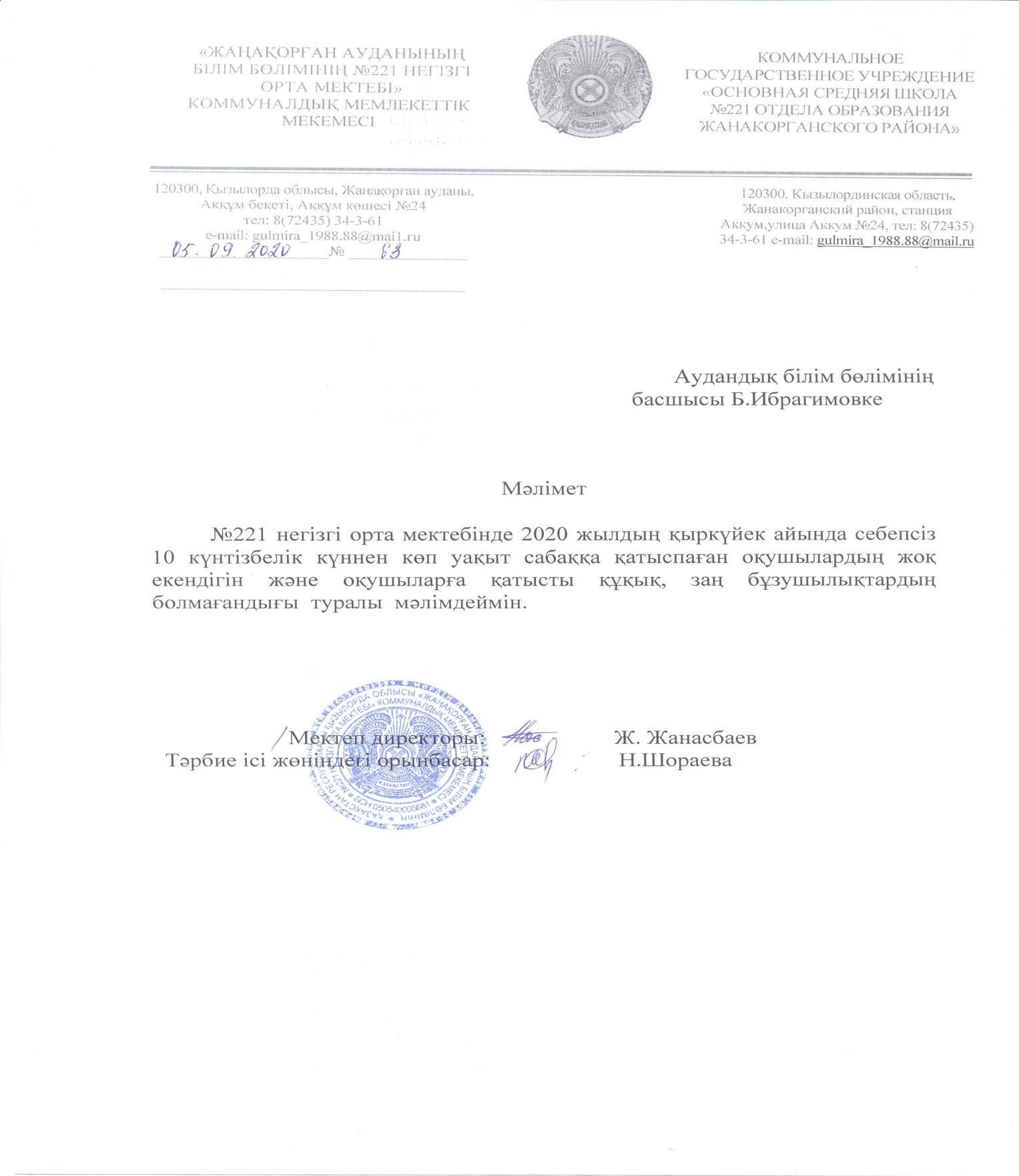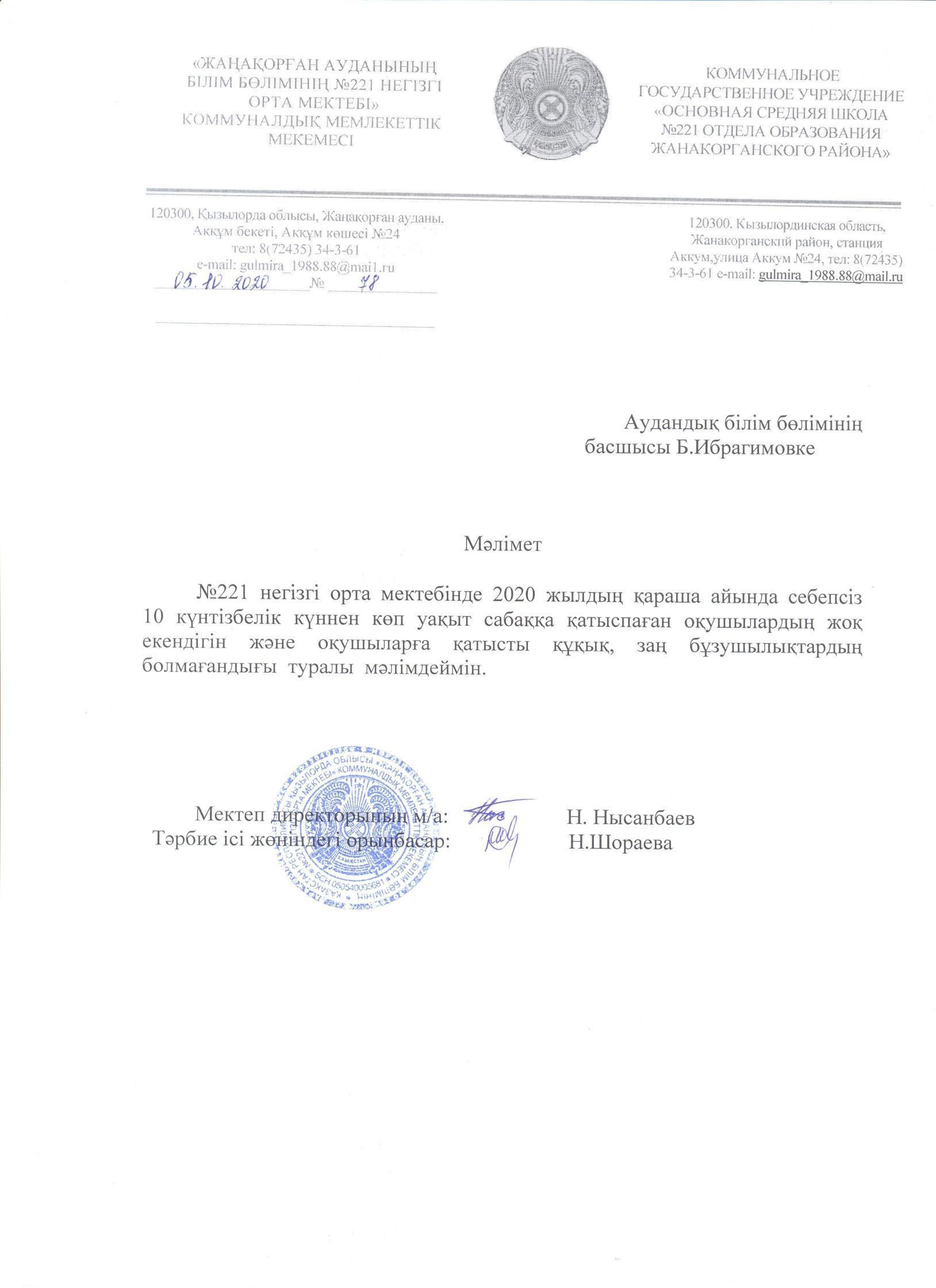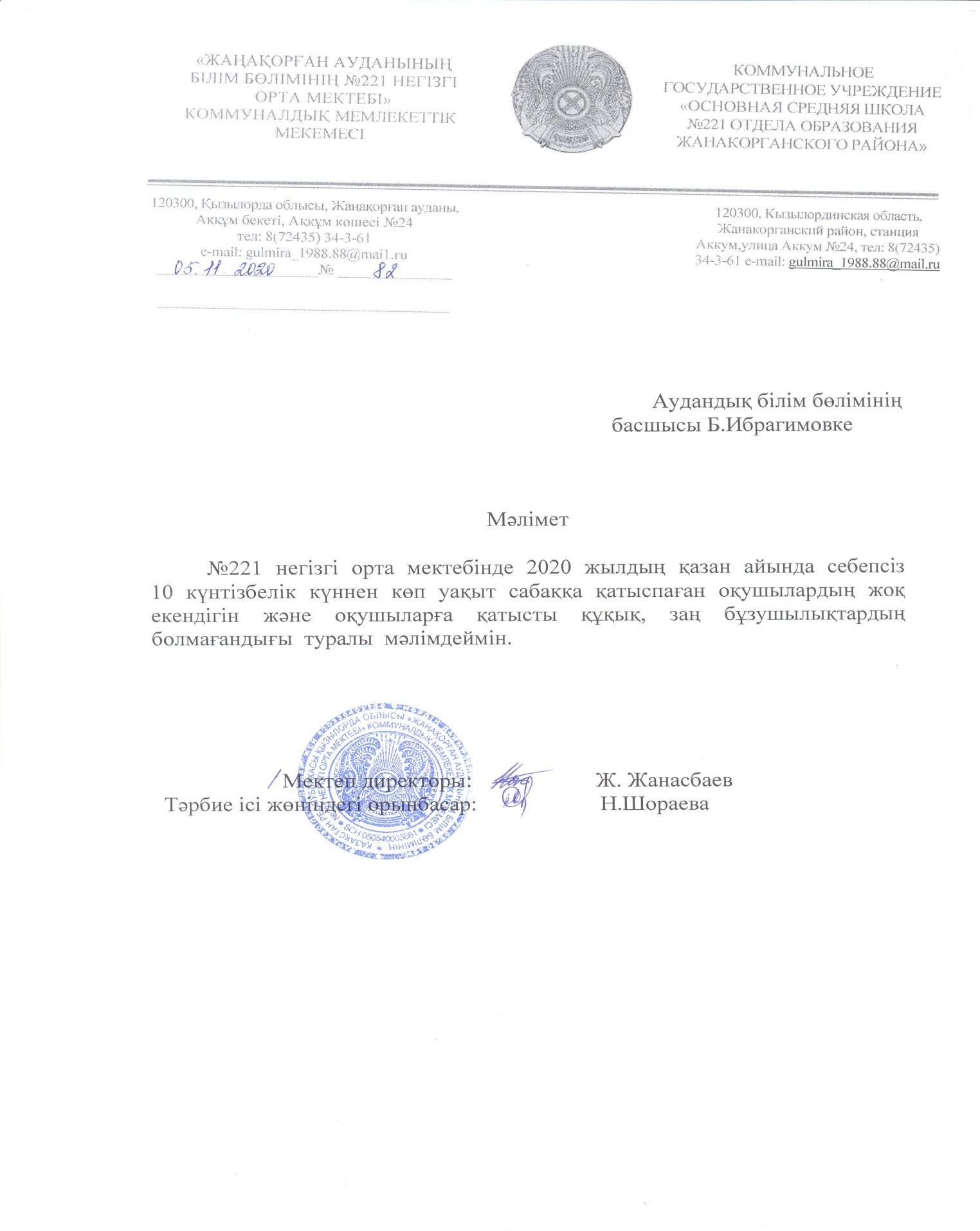 №221 негізгі орта мектебінде мектеп мұғалімдерінен күнделікті кезекшілік ұйымдастырылып, кезекшілік журналы арналған.Кезекшілер күн сайын сабақ басталысымен сынып оқушыларын түгелдеп, сабаққа келмеген оқушы жайлы сынып жетекшілеріне хабарлап,себебін анықтайды.Аудандық білім бөліміне әр айдын 5не дейін бір айдағы дәлелсіз сабақтан қалған оқушының бар-жоқтығы жайлы есеп беріліп келеді.2020-2021 оқу жылының қыркүйек,қазан,қараша айларында дәлелсіз сабақтан қалған оқушы жоқ.