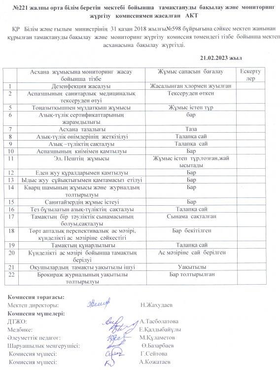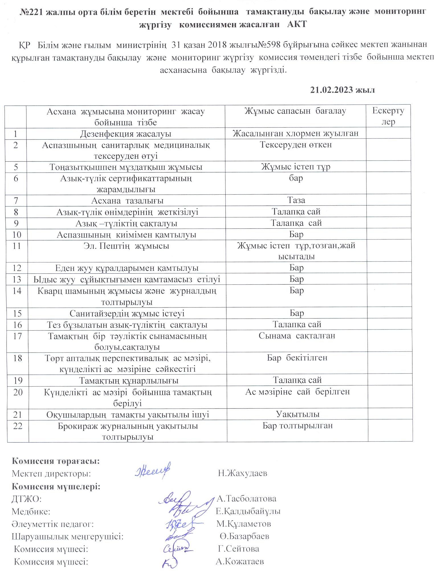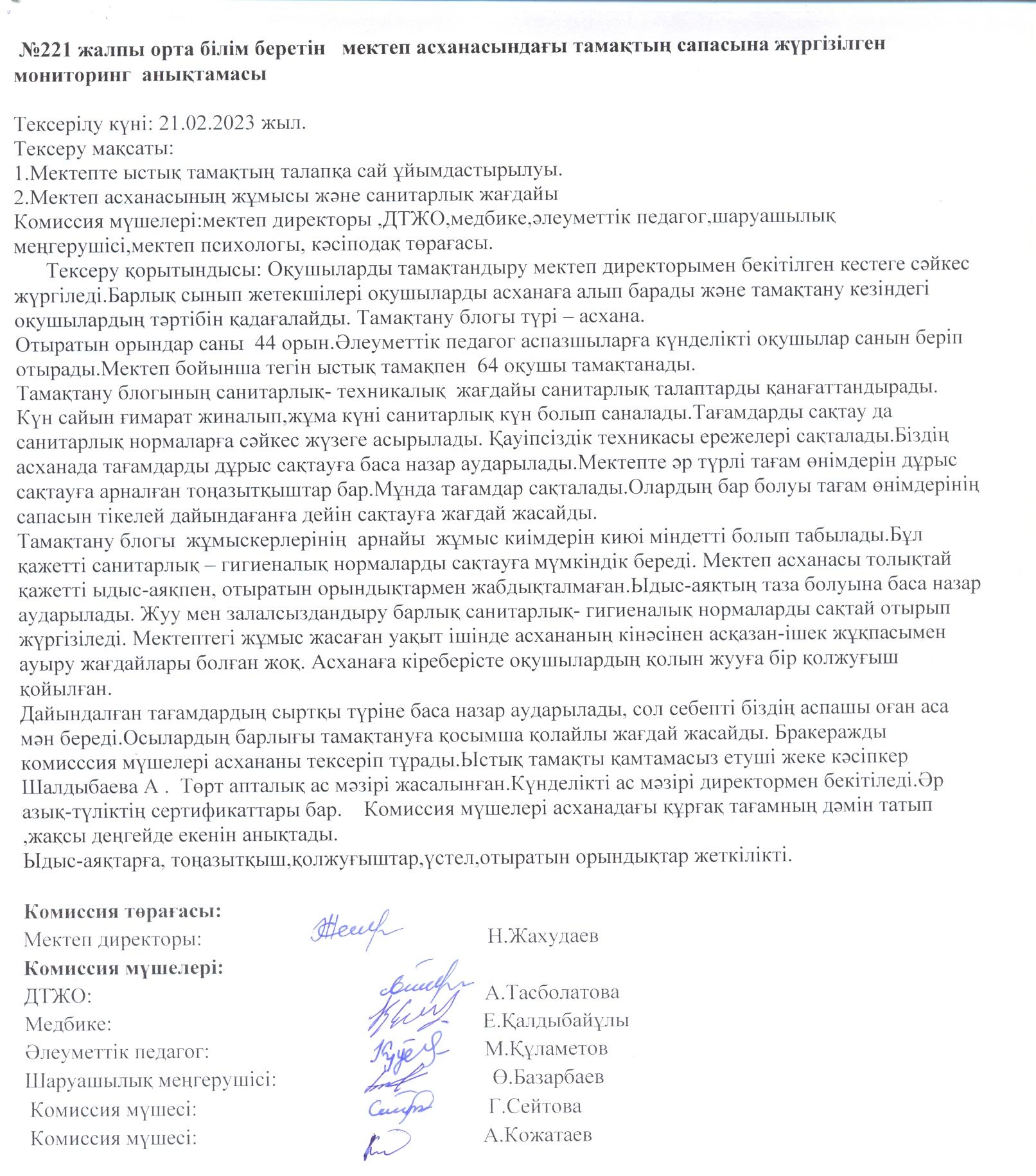 21.02.2023 жылы №221 жалпы орта білім беретін мектеп асханасындағы тамақтың сапасына мониторинг жүргізілді. Тексерудің мақсаты: мектепте ыстық тамақтың талапқа сай ұйымдастырылуы, мектеп асханасының жұмысы және санитариялық жағдайын тексеру.