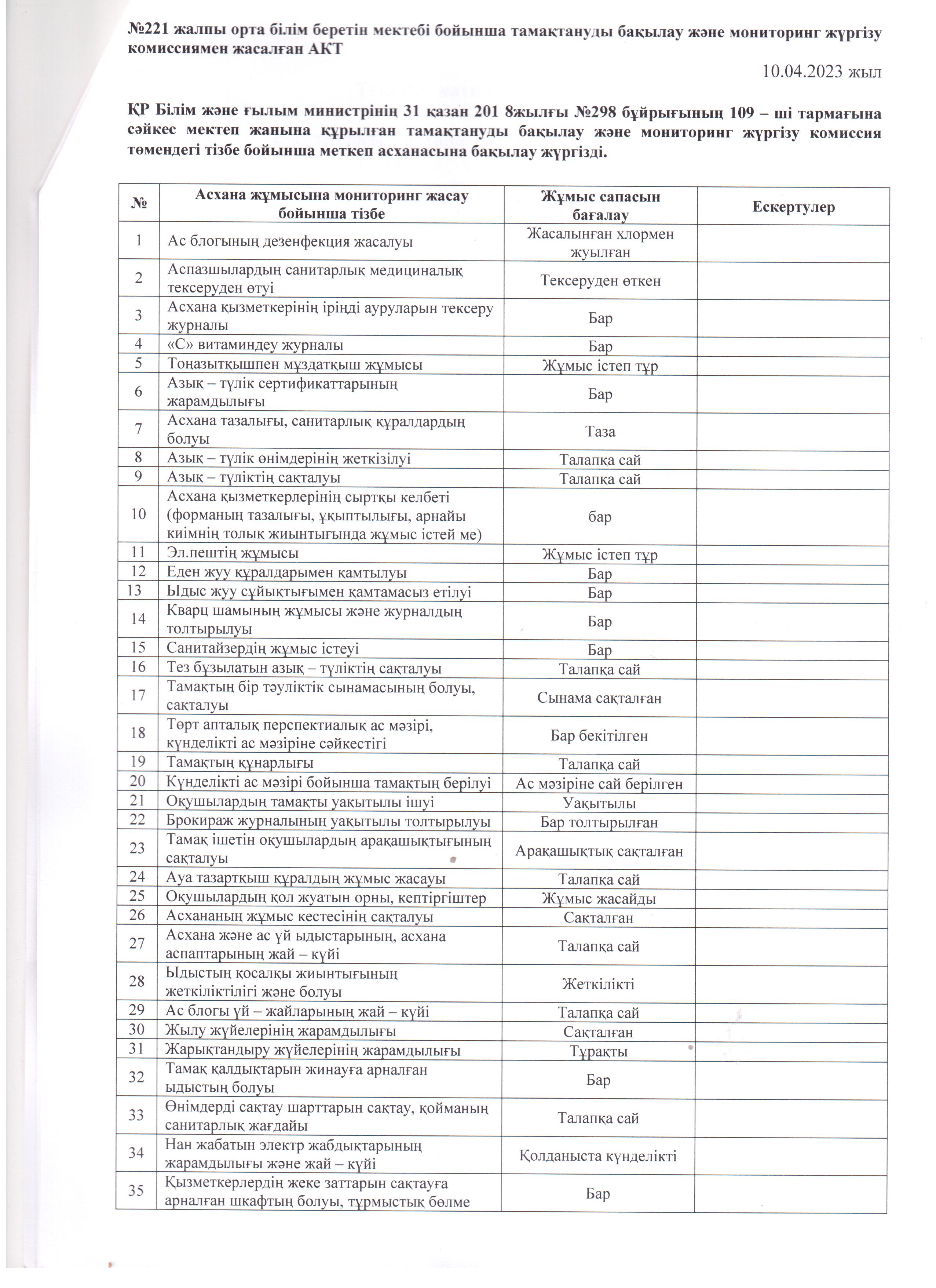 Мектеп асханасындағы тамақтың сапасына жасалынған мониторинг қорытындысы