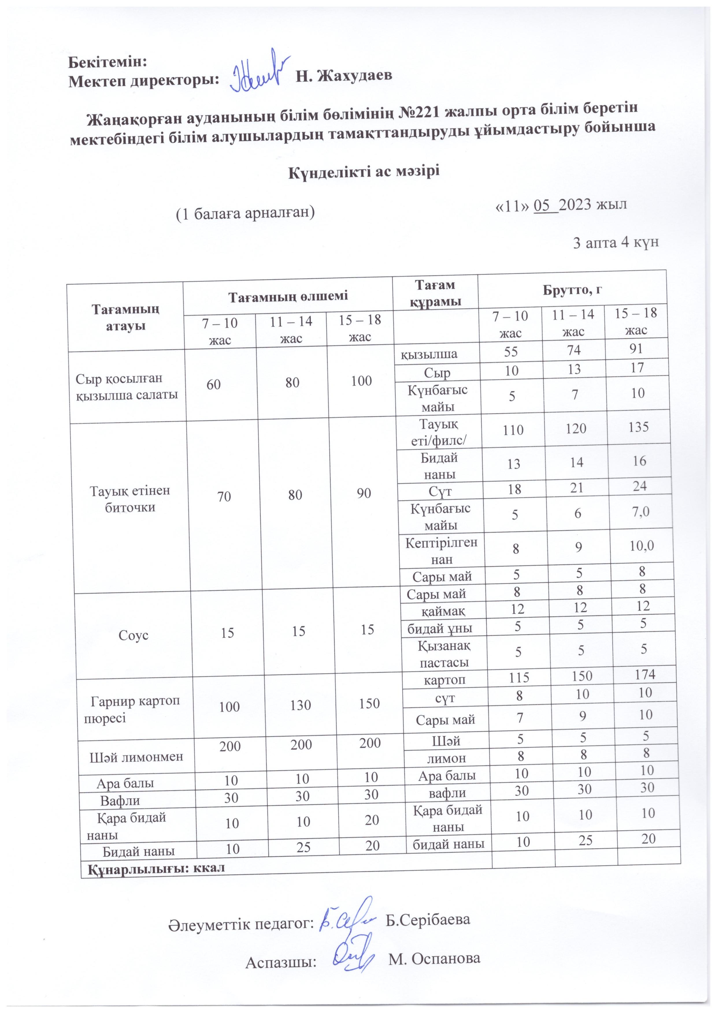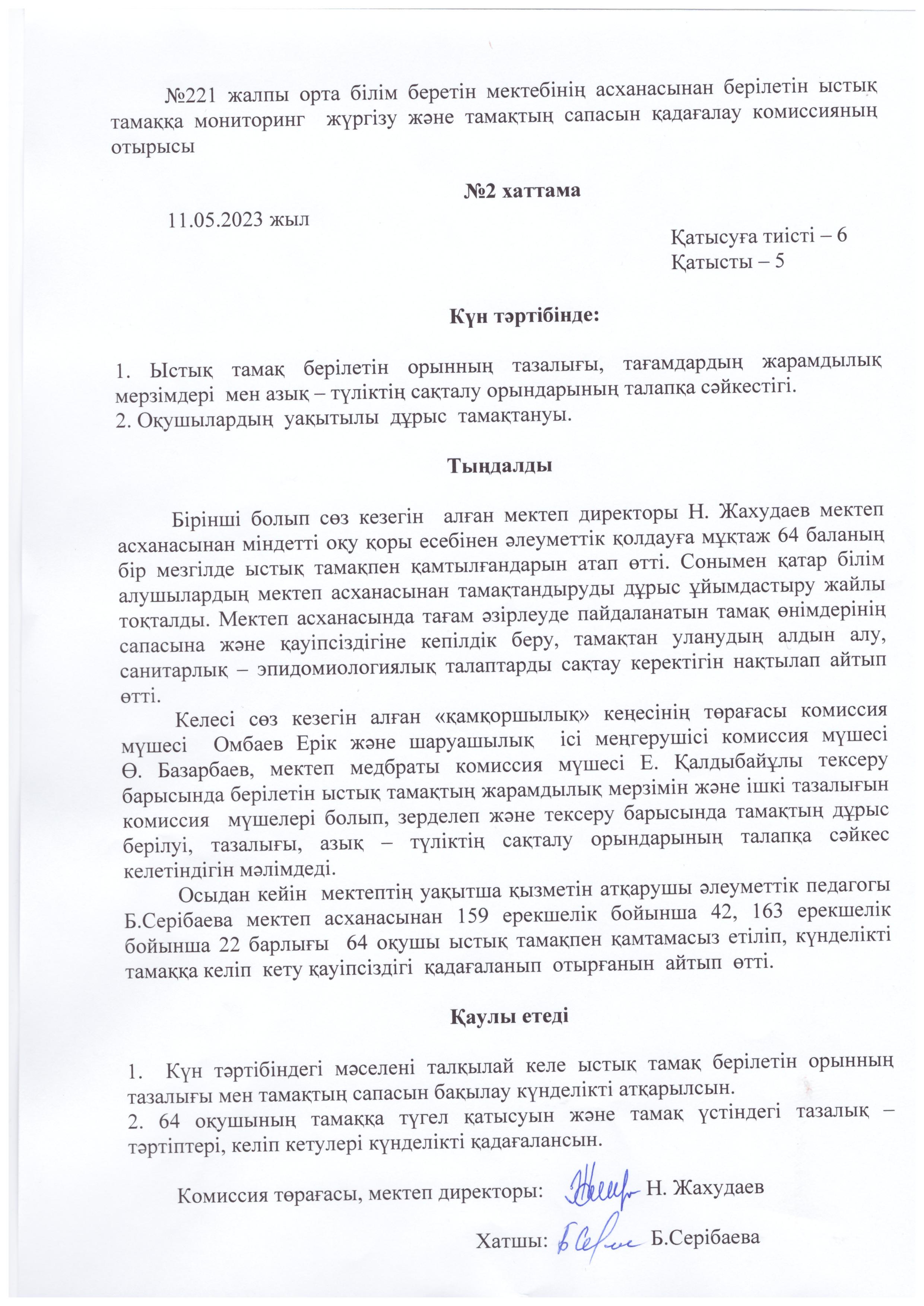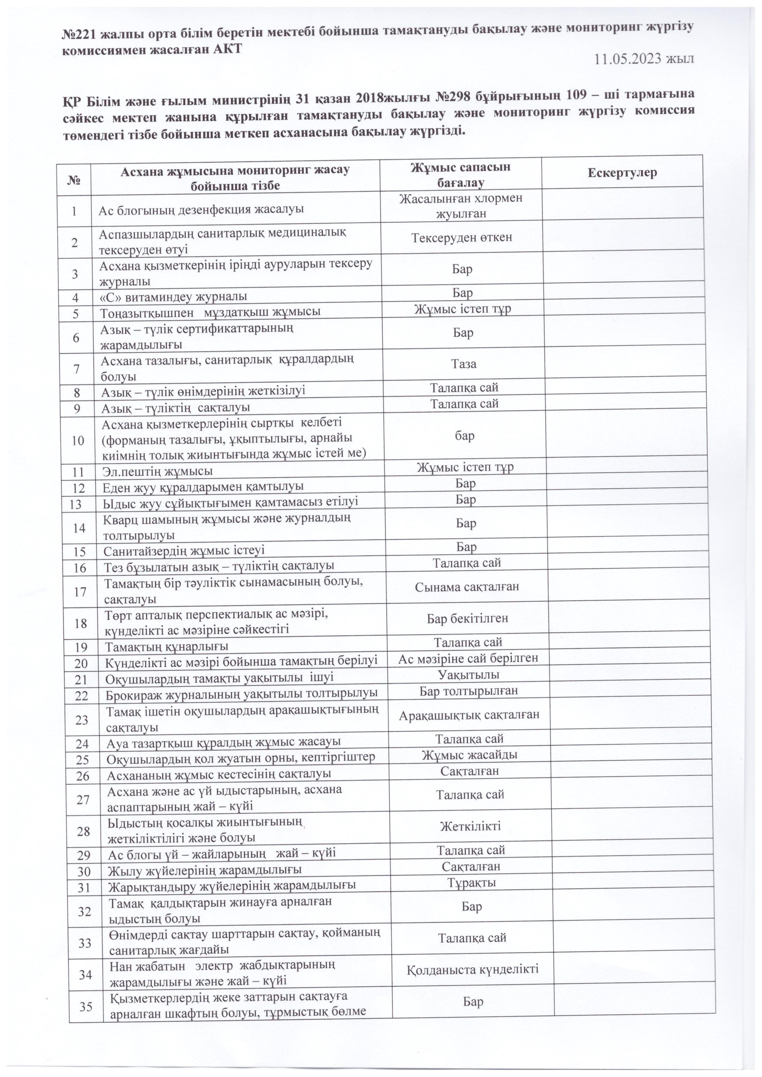Мектеп асханасындағы тамақтың сапасына жасалынған мониторинг қорытындысы » №221 орта мектебі