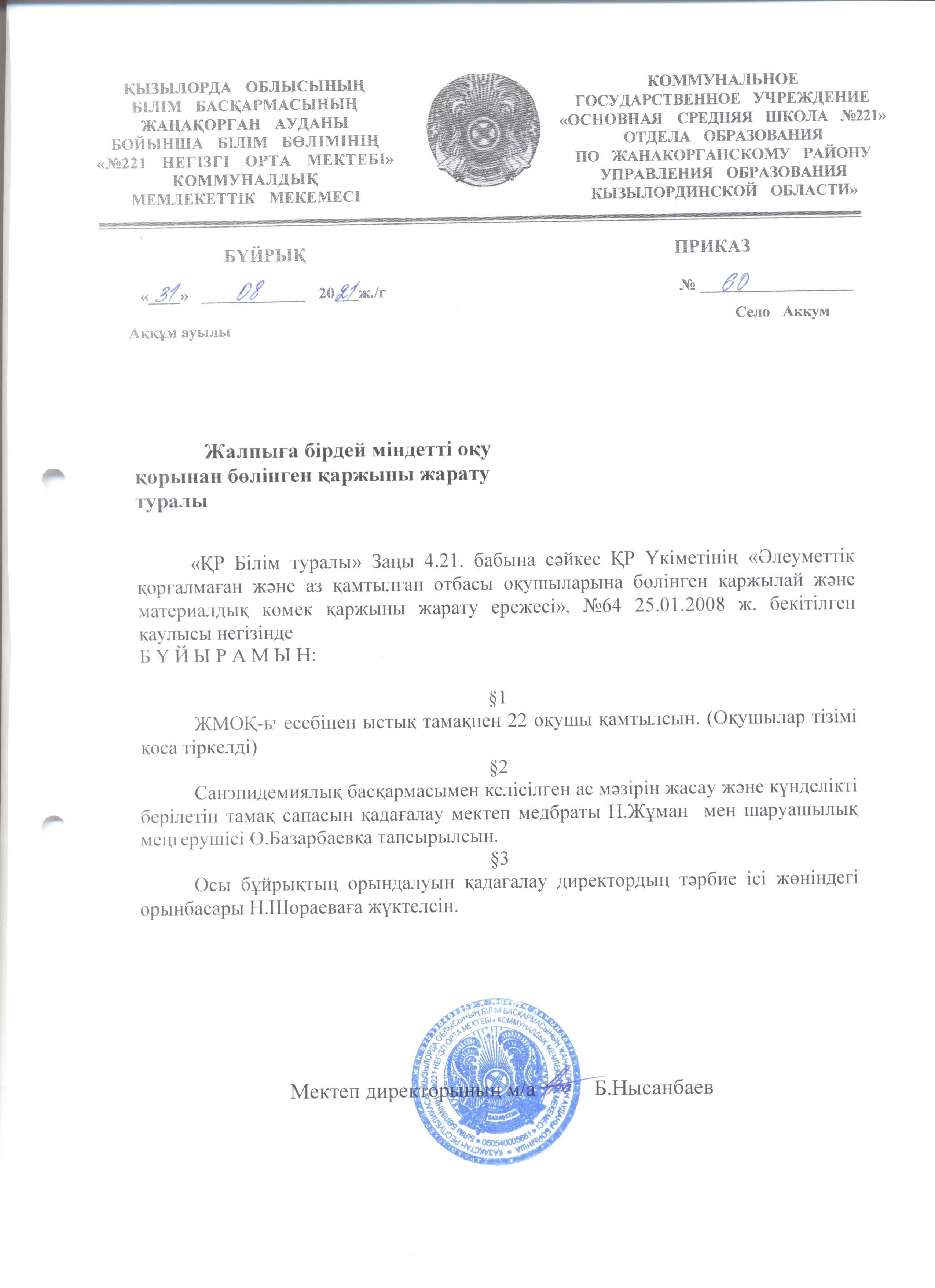 Жалпыға бірдей міндетті оқу қорынан бөлінген қаржыны жарату » №221 орта мектебі