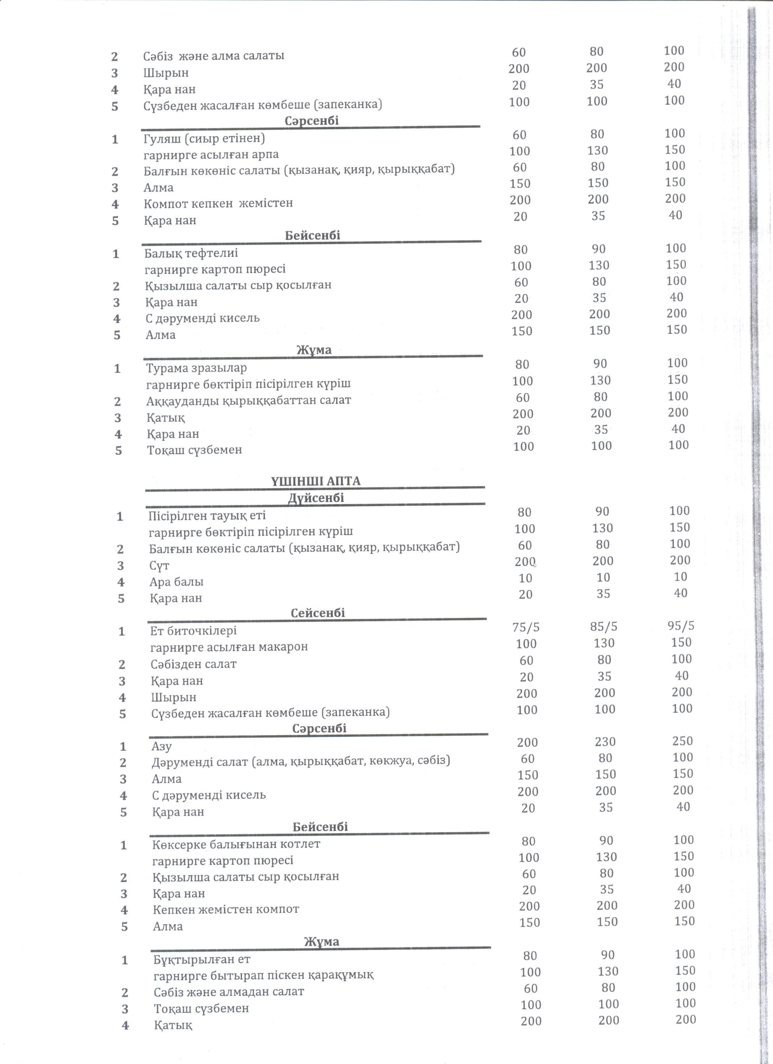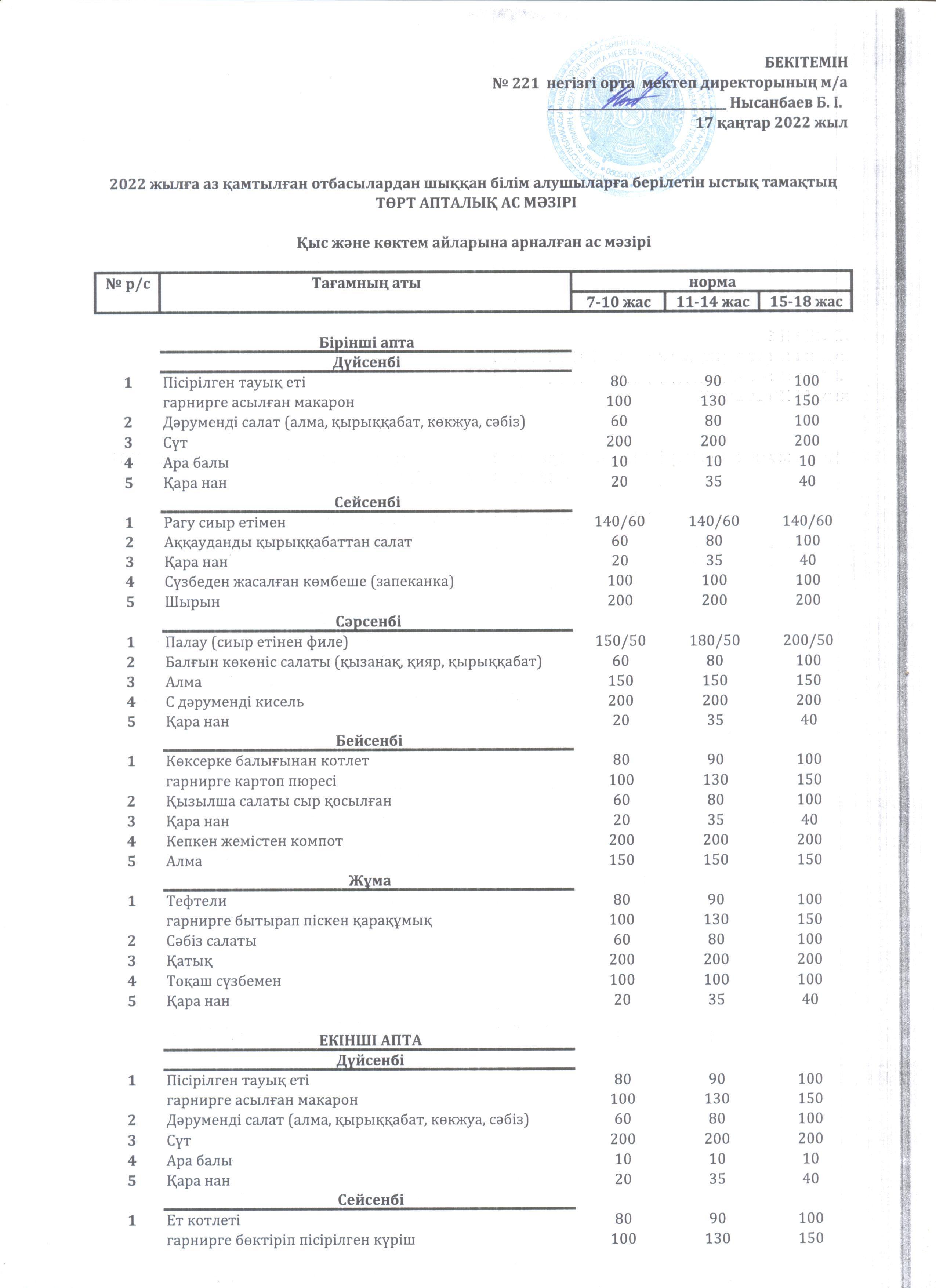 Мектеп асханасының 4 апталық мәзірі » №221 орта мектебі