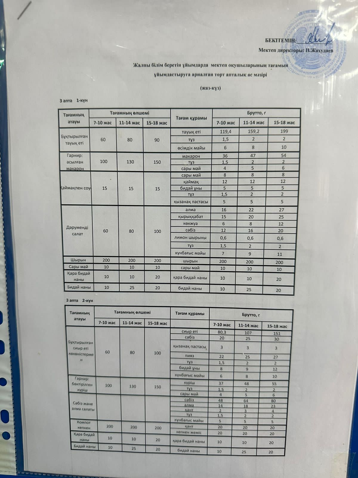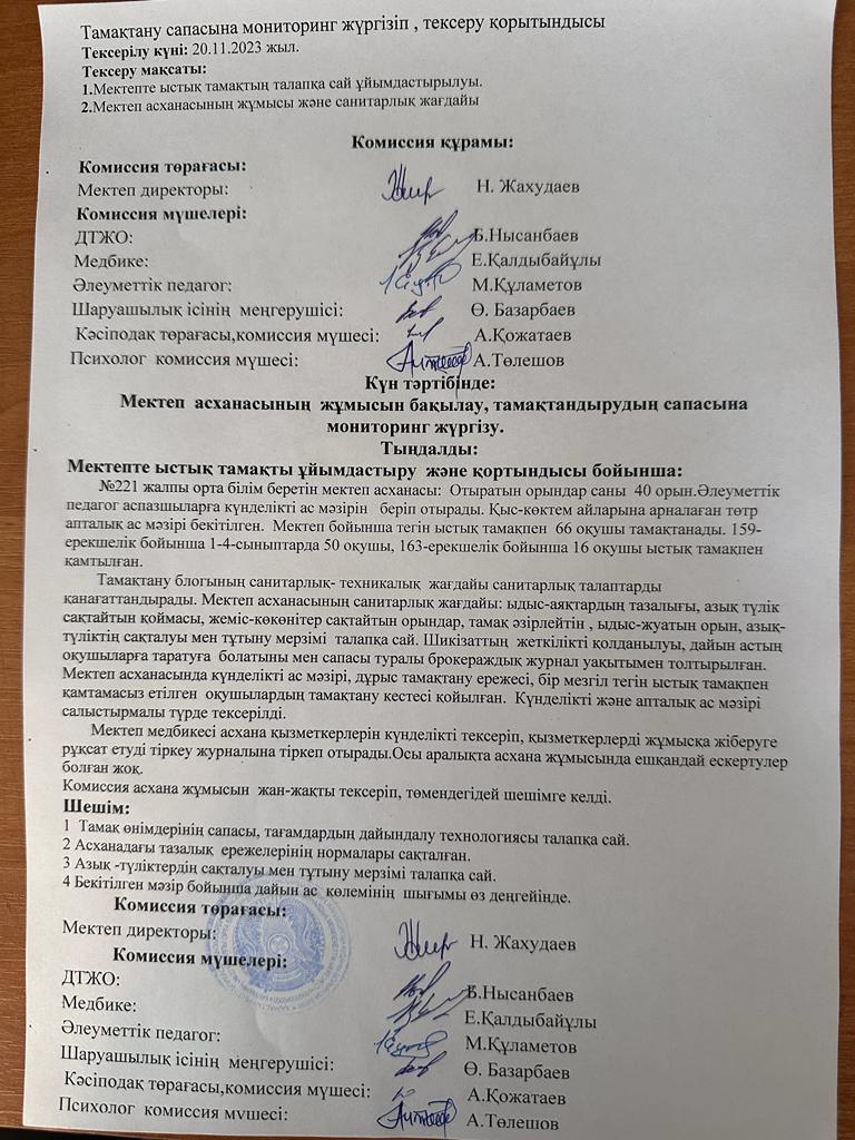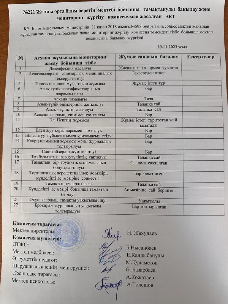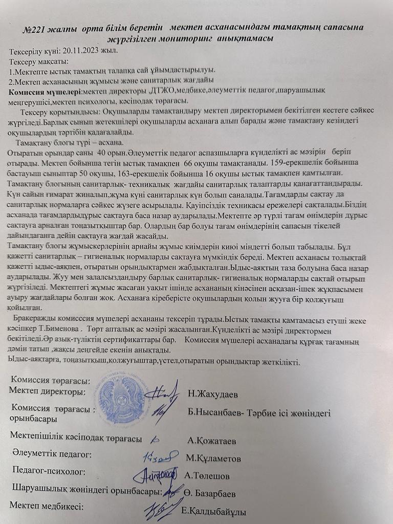 Мониторингтік топ, мектеп асханасының ас мәзіріндегі тамақтың берілу сапасымен танысып, кемшіліктер бойынша қатаң ескертулер жасады. Мектеп директоры Нариман Үсенұлы асханадағы техника қауіпсіздігін және тәртіп ережелерінің сақталуын,қауіпсіздіктің жалпы талаптары орындалуына баса назар аудару керектігін атап өтті.