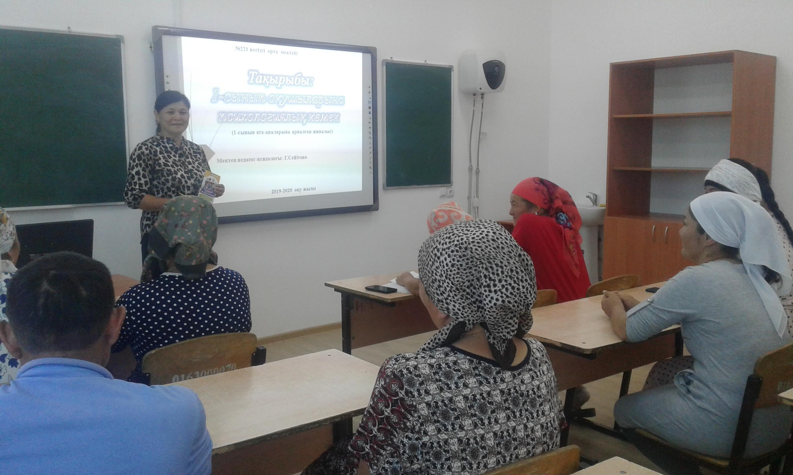 9 қыркүйек 2019 жылы №221 негізгі орта мектебінде 1-сынып оқушыларының ата-аналарымен «Бірінші сынып оқушыларына психологиялық көмек» тақырыбында жиналыс болып өтті. Педагог-психолог Г.Сейтова ата-аналарға баяндаманы презентация ретінде таныстырып, әрбір баланың мектепке келуі, оқуды бастауы, мектептегі талап, оқушы ережесі, баланың психикалық тұлғасы, мектептегі оқудың күшті стресс тудыруы туралы атап өтті. Сонымен бірге ата-аналарға топтық кеңестер берілді.