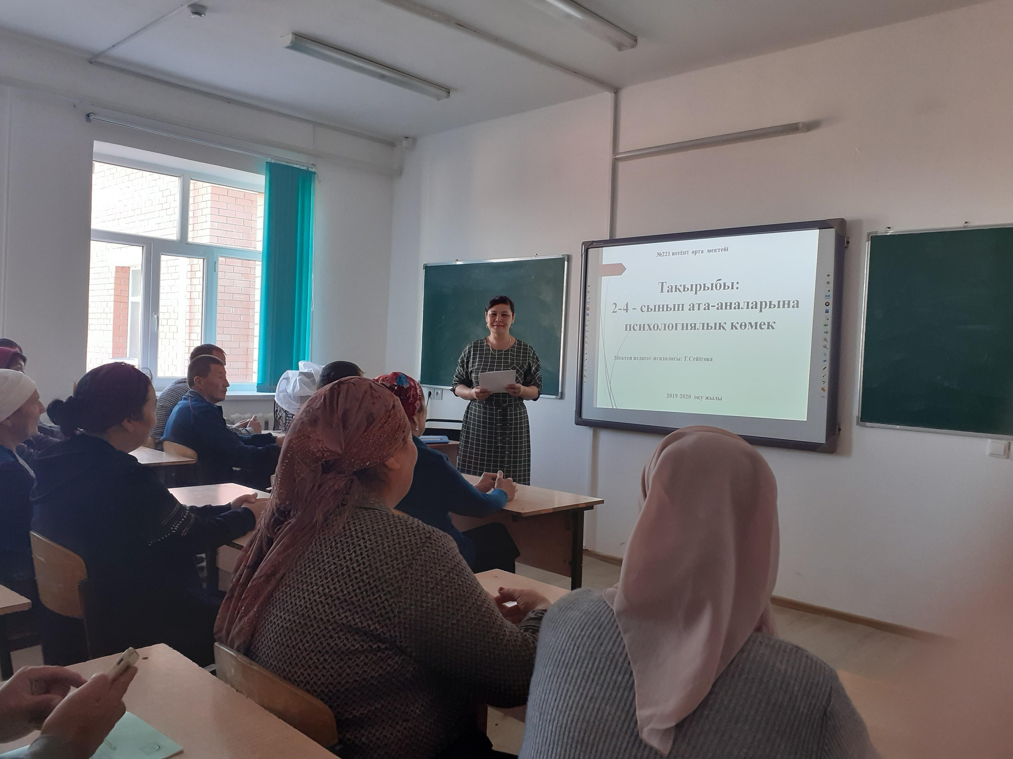 5.10.2019 жылы №221 негізгі орта мектебінде 2-4-сынып ата-аналарымен педагог-психолог Г.Сейтованың ұйымдастыруымен «2-4-сынып оқушыларының ата-аналарына психологиялық көмек» тақырыбында ата-аналар жиналысы болып өтті. Жиналыс барысында отбасының беделін арттыру және дәстүрлі отбасылық құндылықтарды нығайту- Қазақстанның мемлекеттік саясатының басым бағыттарының бірі екенін педагог-психолог Г.Сейтова ата-аналарға түсіндіре отырып, пікірлесу өткізді. Сонымен қатар «Тату отбасы, бақытты балалар- еліміздің гүлденуінің іргетасы» тақырыбында видеоролик көрсетті. Видеороликтен кейін де ата-аналар өз ойларымен бөлісті.